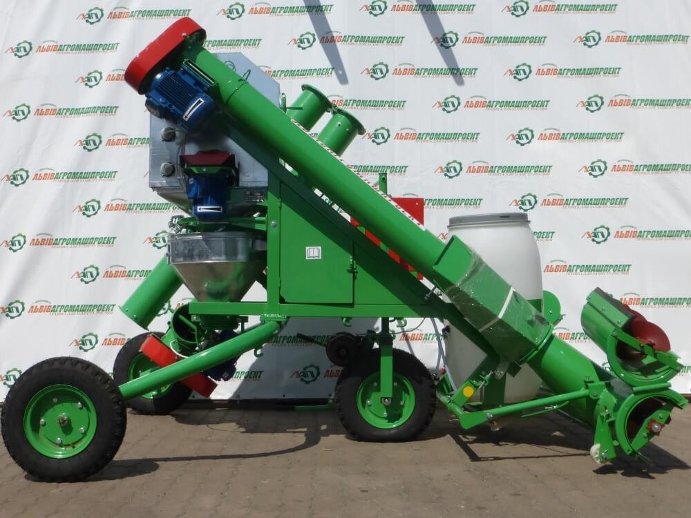 The chamber seed treater is a modern electrically driven self-propelled machine, equipped with elements for controlling the flow of seeds and a peristaltic dosing pump NP-02 for supplying the working liquid. The maximum simple design of the seed treater with few augers minimizes damaging of during their treatment.