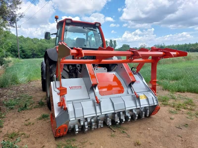 Forestry mulcher best suited for trunks up to 400 mm diameter and for all types of wood, gardening and agricultural uses. The forestry mulcher TFMF Ventura was designed to satisfy the demands of the forestry industry. It can be used for clearing wood thickets, forest tracks, fi rebreak maintenance, and clearing burnt areas for reforestation purposes. It can also be used for clearing non cultivated grounds, electric/telephone line maintenance. The resulting material can be used as organic compost for agriculture and gardening. When used for muching trunks of considerable thickness, the TFMF will leave on the ground a very fi ne material that can be used as compost. Equipment: Freewheel included in the gearbox. TFMF models feature double drive belt system. Hydraulic rear door. Transmission (optional). Reinforced rear pushing bar (optional). Hydraulic third point (optional). Rear door rake (optional)