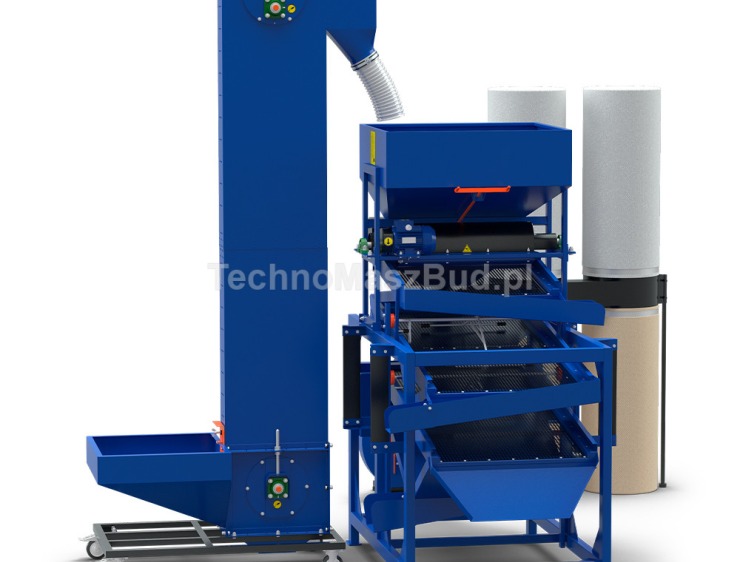 Kaušinis transporteris PK-100 užtikrina švelnų, vertikalų žaliavos transportavimą, sumažindamas grūdų pažeidimo riziką. Kalibratorius KZ-500W atsakingas už tikslų medžiagos rūšiavimą pagal dydį ir efektyvų kietųjų priemaišų atskyrimą, o atsiurbimo sistema SO-2 pašalina lengvas frakcijas, tokias kaip dulkės, pelai ir smulkios atliekos, pagerindama galutinio produkto švarą.